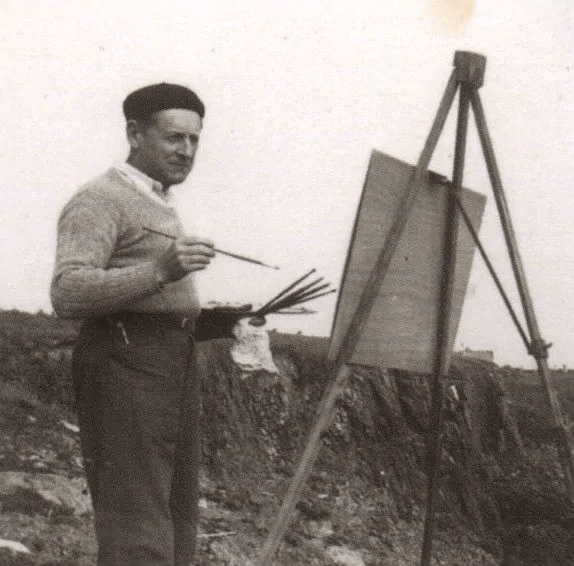 André Jolly est un peintre de Bretagne et d’ailleurs. Originaire de Charleville-Mézières, dès les années 1905, il se rend à Paris et à Pont-Aven, où il concrétise son envie de devenir peintre. Autodidacte, et passionné par l’art de Gauguin et de « l’Ecole de Pont-Aven », il crée pendant la première décennie du XXème des œuvres, débutant dans un style postimpressionniste, et se constitue peu à peu une esthétique propre et originale, entre l’observation des paysages bretons, sa synthèse et le japonisme. La seconde guerre mondiale bouleverse son art, où il se concentre dans la création de dessins montrant la vie à l’arrière et la vie quotidienne dans les tranchées. Cette interruption le mène sans doute après-guerre à la recherche des nouveaux horizons, notamment en Corse, où sa peinture devient alors plus solide et empreinte de maturité. Il interrompt brusquement sa carrière parisienne, dans les années 1920, et ouvre un atelier de pyrogravure à Quimper. Par la suite, l’ensemble de sa création picturale sera de l’ordre de la pratique privée, destinés à ses proches.